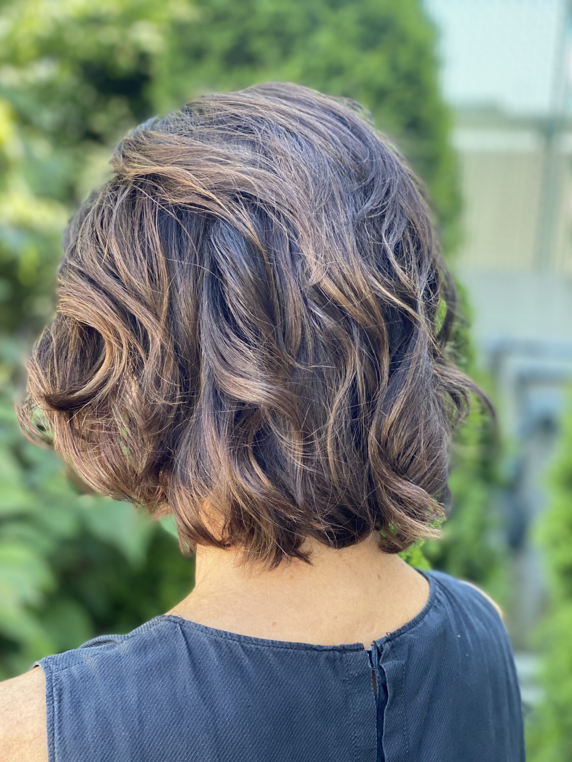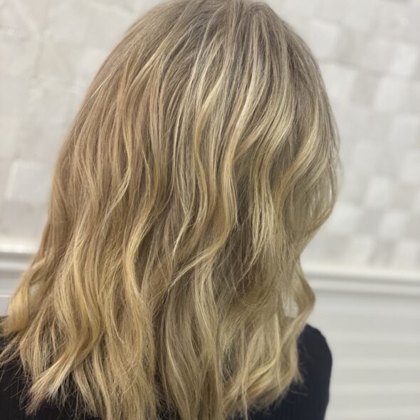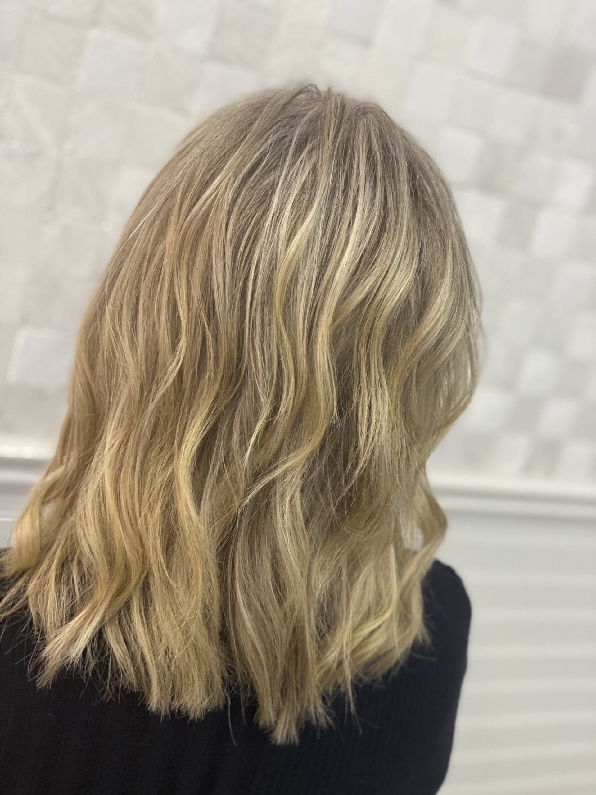 Hair colouring technique involves painting colour onto the hair to create a more natural, blended highlight effect.